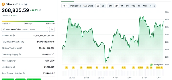 当前阶段,韩国股市暴跌和全球多国股市不景气尚未直接影响BTC价格,截至发稿,BTC报68825.59美元,24小时涨幅0.9%。但若中东冲突持续,包括加密货币在内的金融市场或将面临更大的考验。
