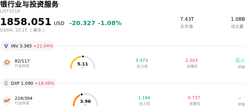桑坦德银行 (SAN) 盘中上涨4.13%, 所属行业银行业与投资服务下跌1.08% ,公司涨幅跑赢行业涨幅,行业涨幅前三股票 Innventure Inc (INV) 上涨 21.04%;Eason Technology Ltd (DXF) 上涨 18.49%;BNB Plus Ord Shs (BNBX) 上涨 7.07%。
