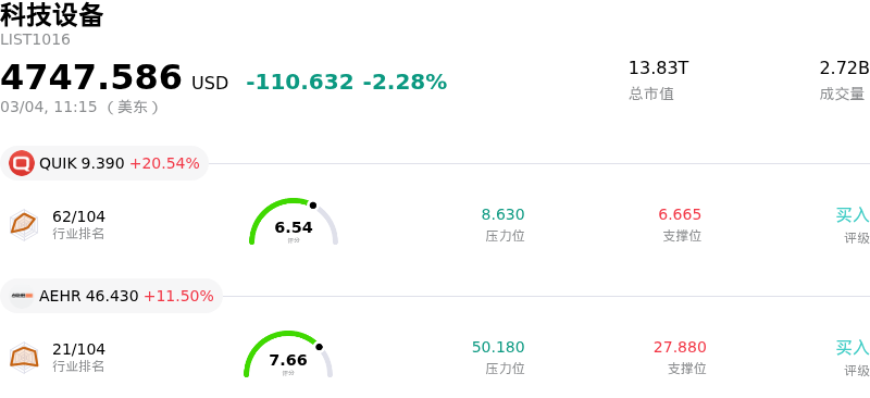 美光科技 (MU) 盘中上涨6.99%, 所属行业科技设备下跌2.28% ,公司涨幅跑赢行业涨幅,行业涨幅前三股票 Quicklogic Corp (QUIK) 上涨 20.54%;Aehr Test Systems (AEHR) 上涨 11.50%;Simpple Ltd (SPPL) 上涨 11.34%。