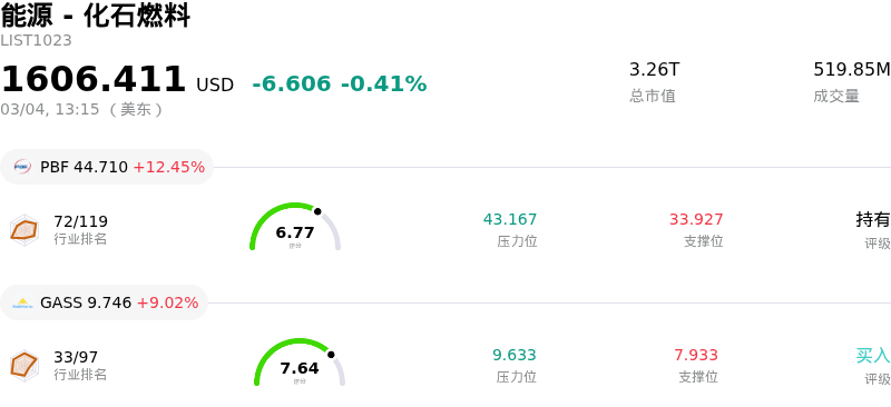 瓦莱罗能源 (VLO) 盘中上涨3.34%, 所属行业能源 - 化石燃料下跌0.41% ,公司涨幅跑赢行业涨幅,行业涨幅前三股票 PBF Energy Inc (PBF) 上涨 12.45%;Sable Offshore Corp (SOC) 上涨 9.96%;StealthGas Inc (GASS) 上涨 9.02%。
