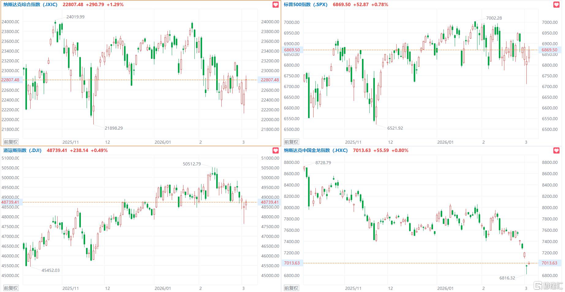 1、美股三大指数集体收涨,英特尔涨超5%,中概指数涨0.8%;