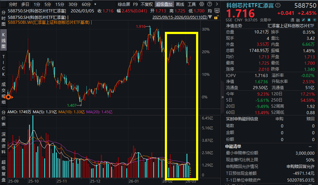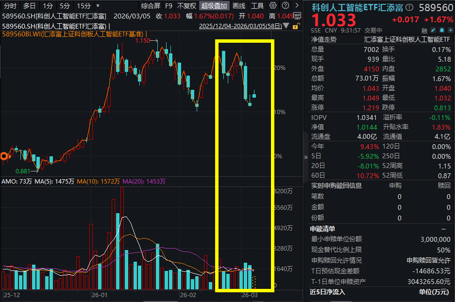 3月5日,全球风险资产回暖!隔夜美股科技板块上冲,今早韩国股市巨幅反弹,A股科技板块强势回归,科创、人工智能主线强势回归!截至9:37,科创芯片ETF汇添富(588750)开盘涨超2%,最新涨2.45%,科创人工智能ETF汇添富(589560)涨1.67%!