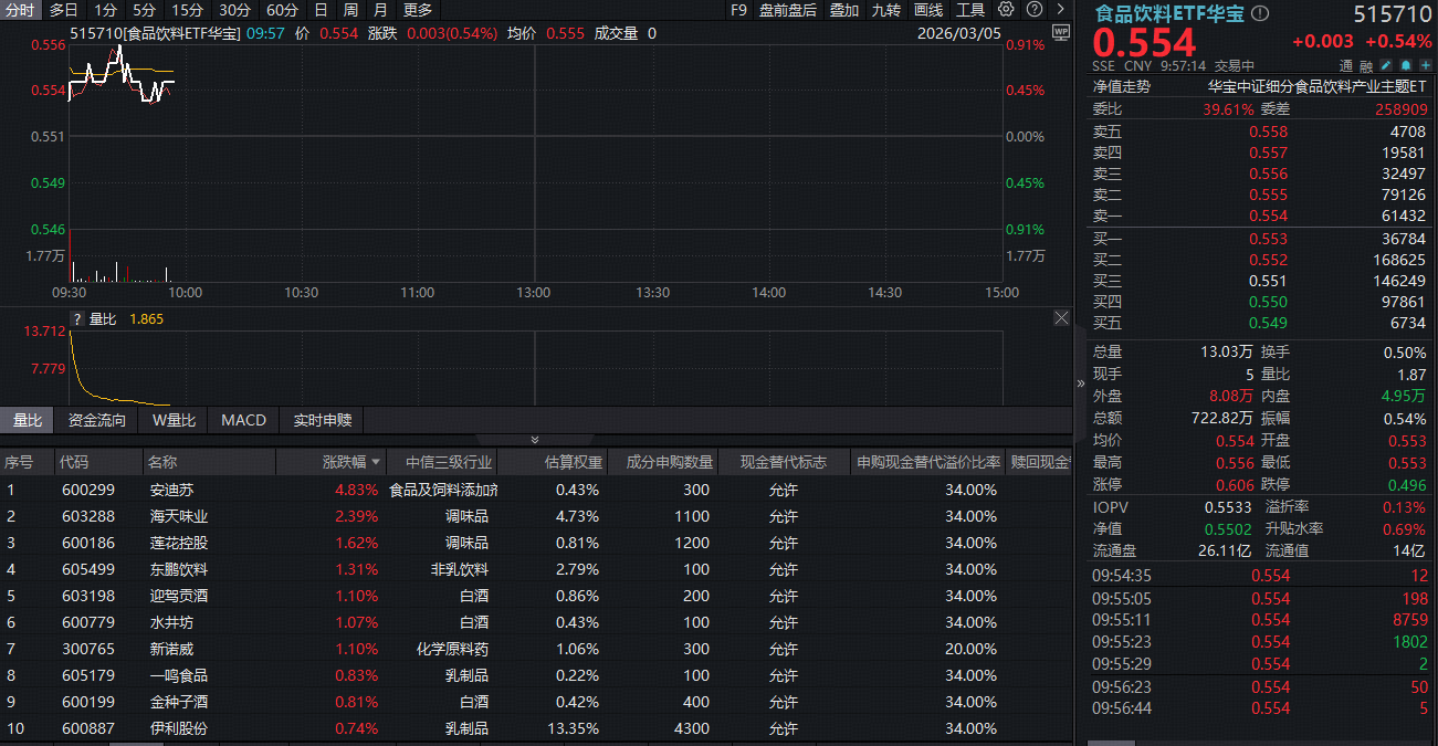 吃喝板块今日(3月5日)止跌回升。反映吃喝板块整体走势的食品饮料ETF华宝(515710)开盘后持续红盘震荡,截至发稿,场内价格涨0.54%。