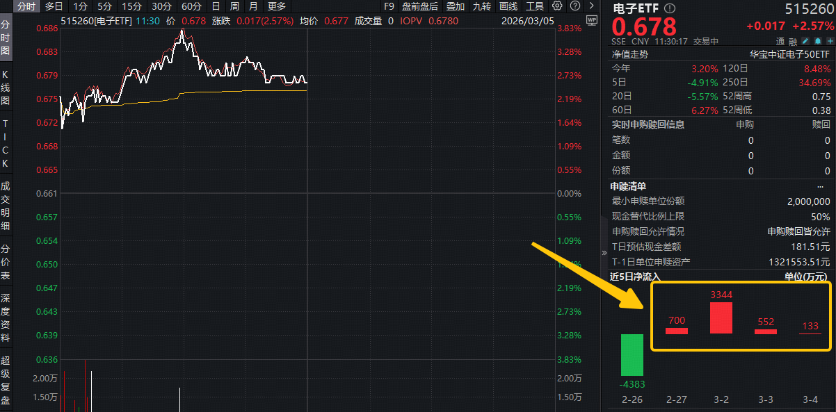 或由于苹果发布MacBook Neo,首次用iPhone芯片做电脑,今日(3月4日)覆盖苹果 半导体产业链的电子ETF(515260)场内涨幅盘中上探3.78%,现涨2.57%,上交所数据显示,该ETF此前4日连续吸金,合计金额4729万元。