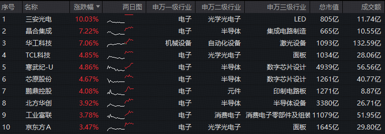 成份股方面,三安光电涨停,晶合集成、华工科技涨超7%,TCL科技、寒武纪-U、芯原股份、鹏鼎控股、工业富联等个股大幅跟涨。