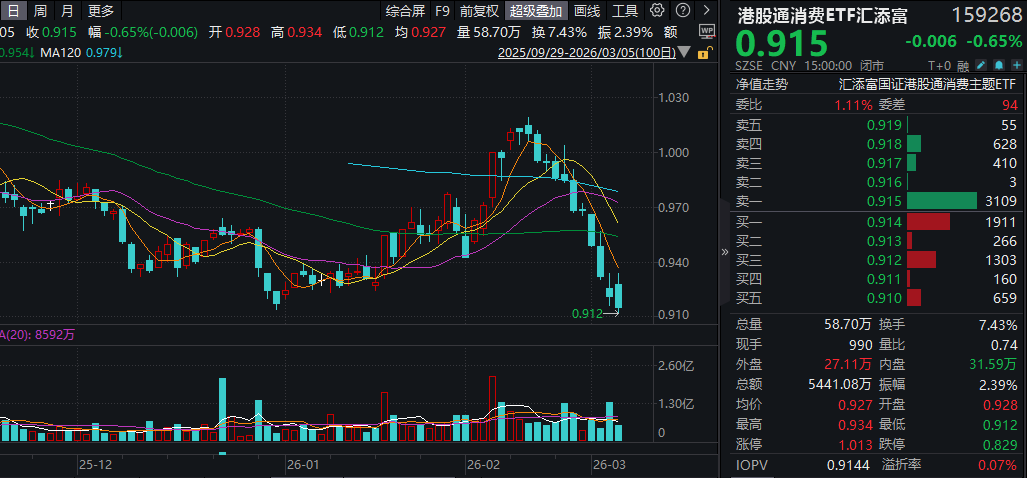 港股消费近期连续回调,聚焦纯正新消费的港股通消费ETF汇添富(159268)收跌0.65%,全天成交额超5400万元!热门成分股多数飘绿,安踏体育跌超1%,百胜中国、泡泡玛特、农夫山泉、万洲国际微跌。(成分股仅做展示,不作为个股推介)