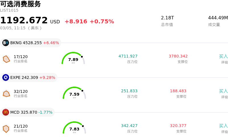 缤客 (BKNG) 盘中上涨6.46%, 所属行业可选消费服务上涨0.75% ,公司涨幅跑赢行业涨幅,行业成交额前三股票 缤客 (BKNG) 上涨 6.46%;Expedia Group Inc (EXPE) 上涨 9.28%;麦当劳 (MCD) 下跌 1.77%。