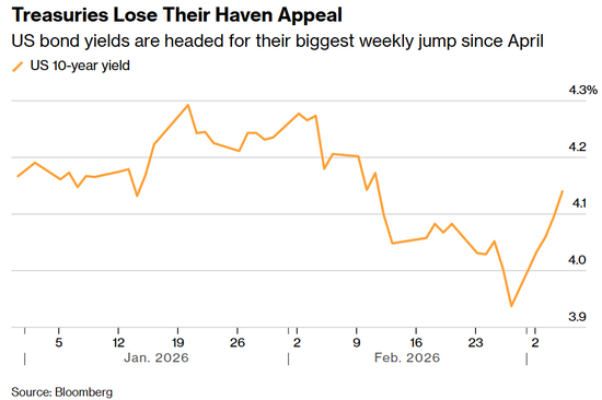 10年期美债收益率本周已飙升20个基点,料创下去年4月关税风波以来最大涨幅。这与上月创下一年来最大跌幅形成戏剧性反转。
