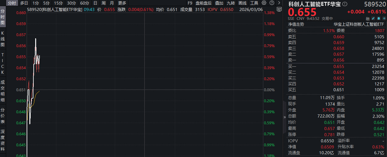 盘面上,周五(3月6日)重点布局国产AI产业链的科创人工智能ETF(589520)逆市活跃,场内涨幅盘中摸高0.92%,现涨0.61%。