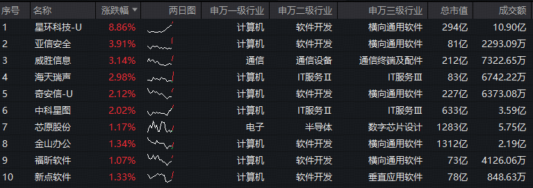 成份股方面,星环科技-U领涨超8%,亚信安全、威胜信息涨逾3%,海天瑞声、奇安信-U、中科星图、芯原股份、金山办公等个股跟涨。