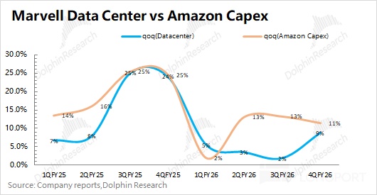 如果将迈威尔科技 Marvell 数据中心的表现与亚马逊资本开支结合起来看,可以清楚地看到,公司数据中心的增速是明显低于亚马逊的资本开支。
