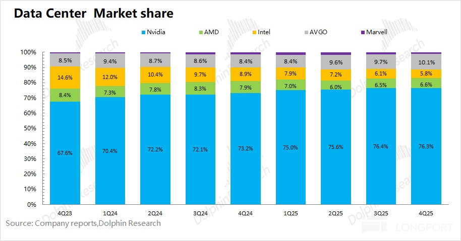 当前 AI 业务已经占据数据中心业务中的大部分,海豚君预期公司本季度 AI 收入约为 9.6 亿美元,环比增加 1.1 亿;而非 AI 业务的存储等产品本季度实现环比微增。AI 业务占总收入的占比维持在 40% 以上,公司管理层此前的目标就是将 AI 收入占比提升至 50% 以上。