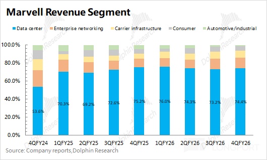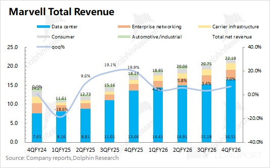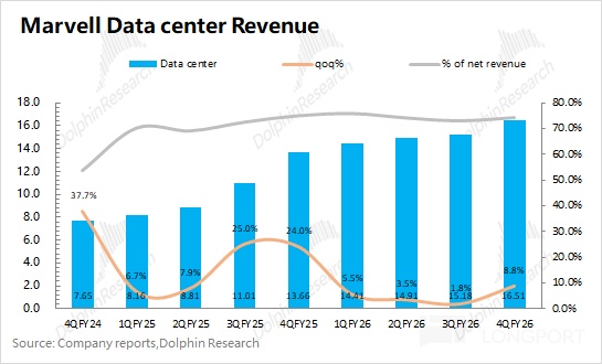 迈威尔科技 Marvell 在 2026 财年第四季度的数据中心业务实现营收 16.5 亿美元,环比增长 8.8%,符合市场预期(16.4 亿美元)。公司数据中心业务本季度的增长主要来自于定制 ASIC 及光电互连产品的带动。