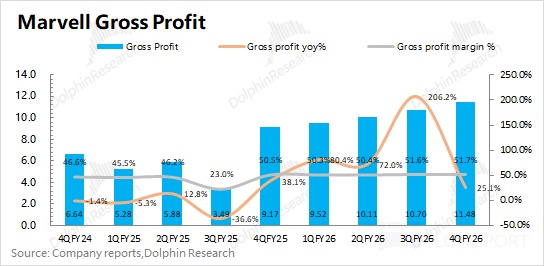 迈威尔科技 Marvell 在 2026 财年第四季度实现毛利 11.5 亿美元,环比增加 0.8 亿美元。其中 Marvell 在本季度的毛利率为 51.7%。