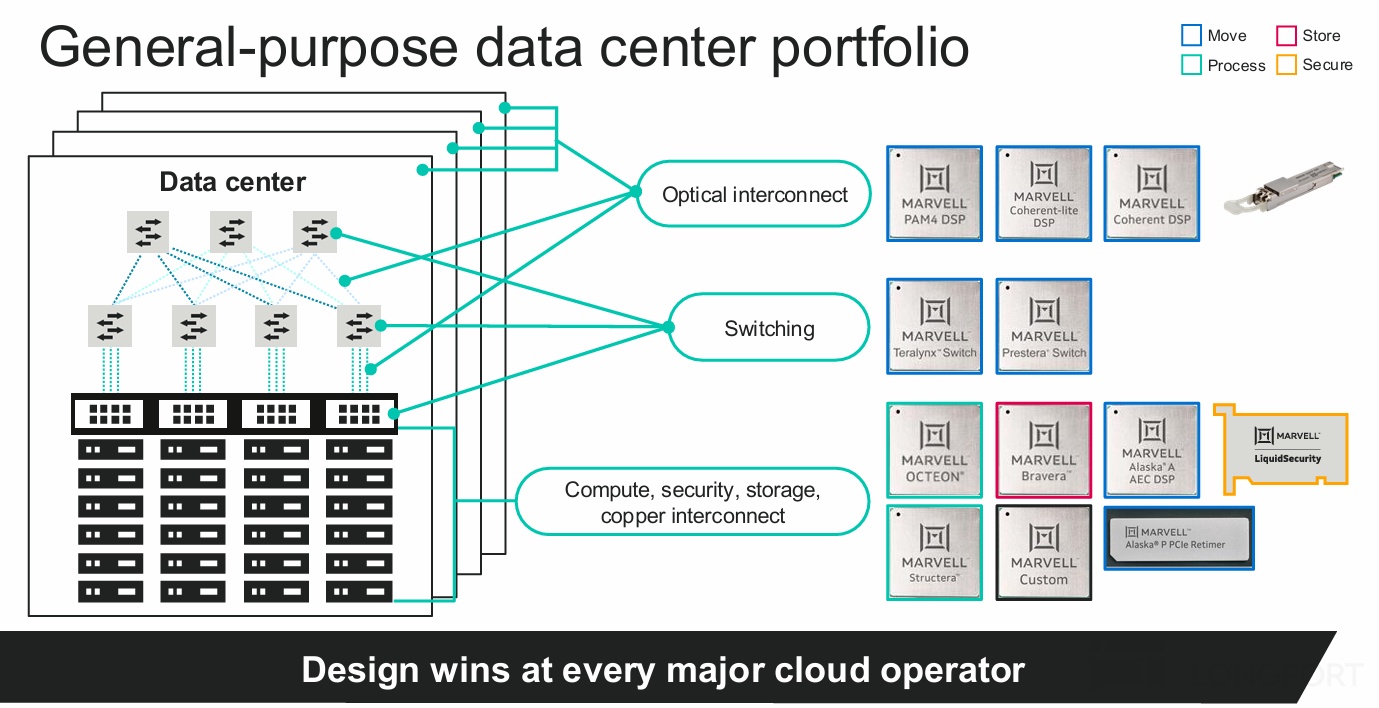 迈威尔科技 Marvell 从 2018 年起陆续收购了 Cavium、Innovium 等公司,从而增强了公司 ASIC 及数据中心的相关能力。而随着亚马逊、谷歌等公司对定制 ASIC 和光电互连产品需求的增长,公司的数据中心业务呈现上升的趋势,是公司业绩的最大影响项。
