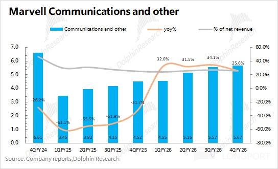 迈威尔科技 Marvell 在 2026 财年第四季度的通信及其他业务实现营收 5.7 亿美元,同比增长 25%,主要得益于企业网络及运营商基建业务的回暖。