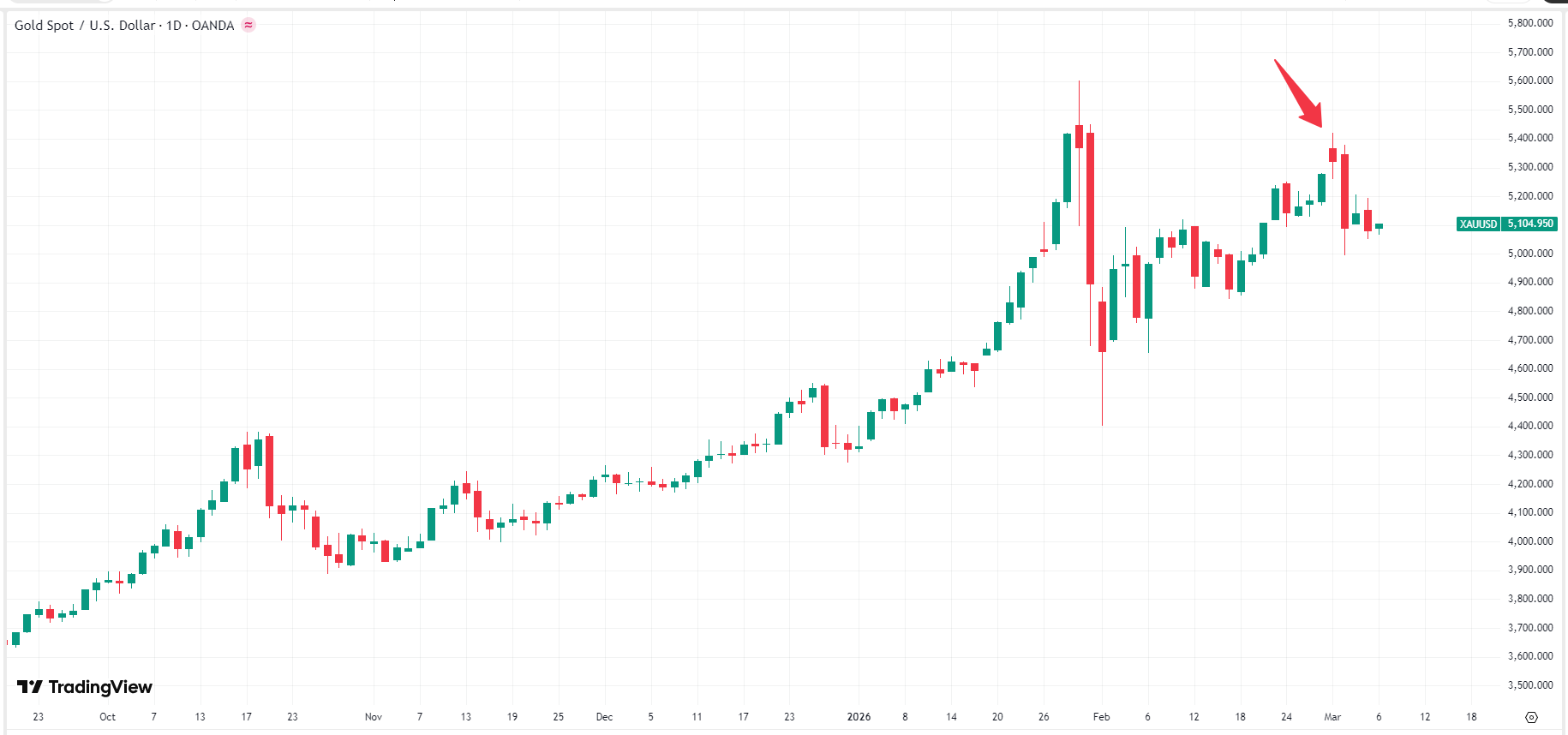 3月2日(美伊战争之后的第一个交易日),现货黄金(XAUUSD)价格当天冲高至5,400美元/盎司,逐渐接近历史高点。然而,黄金价格并没有向上突破,而是迎来获利盘的猛烈抛售。目前,黄金价格徘徊于5,100美元附近,最近5个交易日累计下跌1%。
