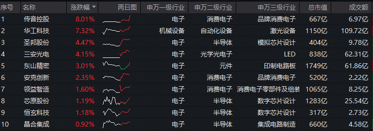 成份股方面,传音控股领涨超8%,华工科技涨逾7%,圣邦股份、三安光电涨超4%,东山精密、安克创新、领益智造等个股跟涨。