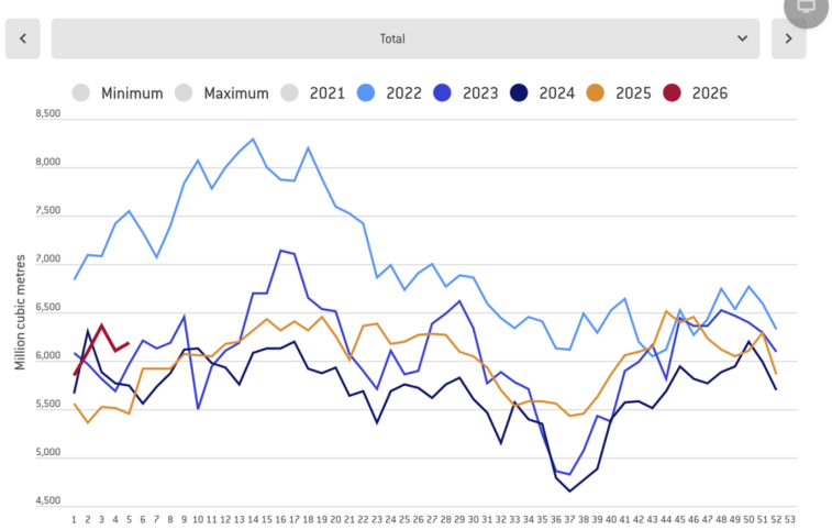 图:欧洲天然气进口量2月环比上升5.24%