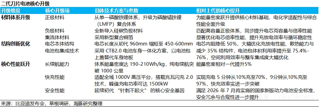 二代刀片电池通过材料体系优化(磷酸锰铁锂复合正极、硅碳负极、复合铜箔)与结构创新(缩短电芯长度及 CTB 2.0 架构),电池系统能量密度提升约 5%,达到 190-210Wh/kg。
