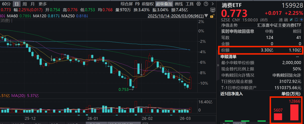 今日(3.6),A股三大指数集体上涨,大消费板块四连阴后首度大涨反攻,规模领先的消费ETF(159928)罕见大涨超2%,全天放量成交超7.4亿元,环比大增116%!资金连续第三天狂涌,全天净流入2.2亿份,3天累计“吸金”超3.5亿元,消费ETF最新规模超213亿元,同类持续领先!