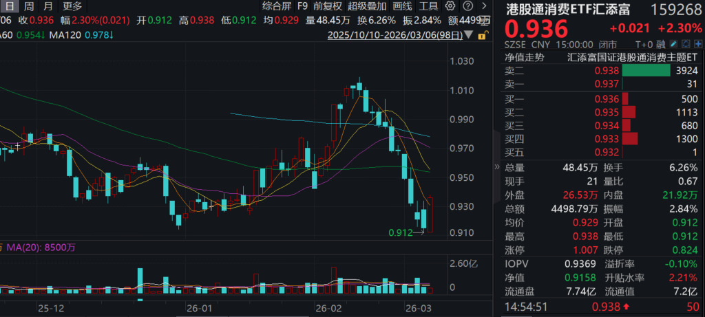风险提示:基金有风险,投资需谨慎。投资人应当阅读《基金合同》《招募说明书》《产品资料概要》等法律文件,了解基金的风险收益特征,特别是特有风险,并根据自身投资目的、投资经验、资产状况等判断是否和自身风险承受能力相适应。基金管理人承诺以诚实信用、谨慎尽责的原则管理和运用基金资产,但不保证基金一定盈利或本金不受损失。上述产品均属于风险较高等级(R4)产品,适合经客户风险等级测评后结果为进取型(C4)及以上的投资者。文中提及个股仅为指数成份股客观展示列举,本文出现信息只作为参考,投资人须对任何自主决定的投资行为负责。本文中的任何观点、分析及预测不构成对阅读者任何形式的投资建议。港股通消费ETF汇添富(159268)的基金投资范围包括港股,会面临因投资环境、投资标的、市场制度以及交易规则等差异带来的特有风险。投资者在申购/赎回ETF基金份额时,申购赎回代理券商可按照不超过0.50%的标准收取佣金,其中包含证券交易所、登记机构等收取的相关费用。其他基金的销售费用请参见相应基金的招募说明书、产品资料概要等法律文件。投资者在申购/赎回ETF基金份额时,申购赎回代理券商可按照不超过0.50%的标准收取佣金,其中包含证券交易所、登记机构等收取的相关费用。其他基金的销售费用请参见相应基金的招募说明书、产品资料概要等法律文件。