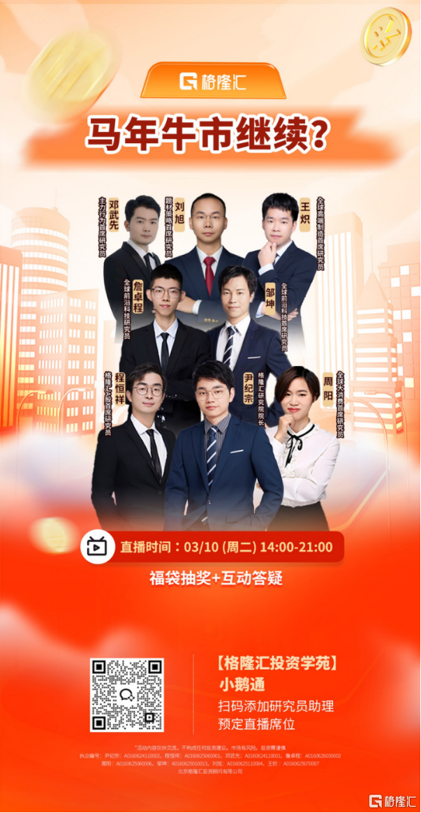 另外,2026年3月10日(下周二),格隆汇研究院院长将带领格隆汇各行业首席研究员为大家带来大场直播活动——“马年牛市继续?”,精彩内容不容错过!