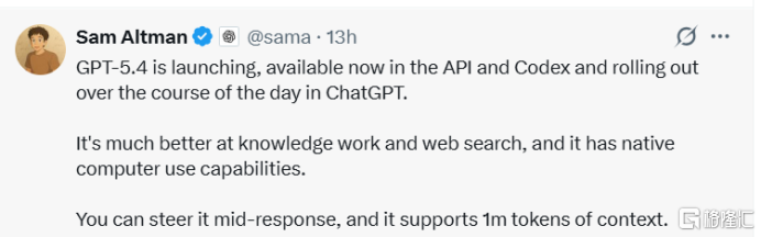 Sam Altman在社交平台上发文,明确点出其更新的五个方向:知识工作更强、网页搜索更出色、原生计算机操控、响应过程中随时可调整、支持百万Token上下文。