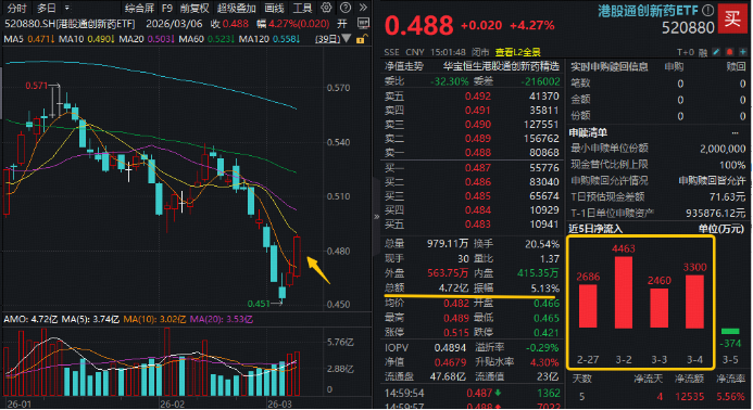 生物医药首列“新兴支柱产业”,3月6日,A H医药资产大受提振,创新药领衔涨势!100%创新药研发标的——港股通创新药ETF(520880)放量续涨4.27%,两日累涨超7%,近5日亿元级资金提前埋伏。重仓A股创新药的药ETF(562050)涨3.15%三连阳