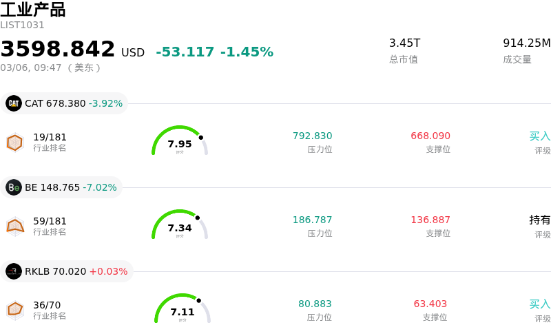 Caterpillar Inc (CAT) 开盘下跌3.92%, 所属行业工业产品下跌1.45% ,公司涨幅跑输行业涨幅,行业成交额前三股票 Caterpillar Inc (CAT) 下跌 3.92%;Bloom Energy Corp (BE) 下跌 7.02%;Rocket Lab USA Inc (RKLB) 上涨 0.03%。