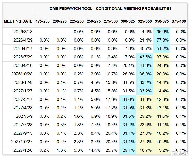 交易员预计联邦公开市场委员会(FOMC)将在3月17日和18日举行的为期两天的会议上继续维持利率在3.5%至3.75%的区间不变概率为95.6%。