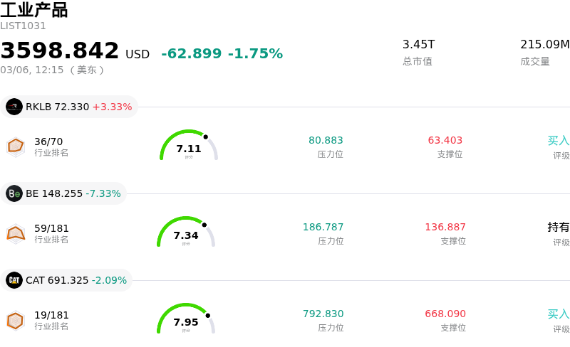 特灵科技 (TT) 盘中下跌3.15%, 所属行业工业产品下跌1.75% ,公司涨幅跑输行业涨幅,行业成交额前三股票 Rocket Lab USA Inc (RKLB) 上涨 3.33%;Bloom Energy Corp (BE) 下跌 7.33%;Caterpillar Inc (CAT) 下跌 2.09%。