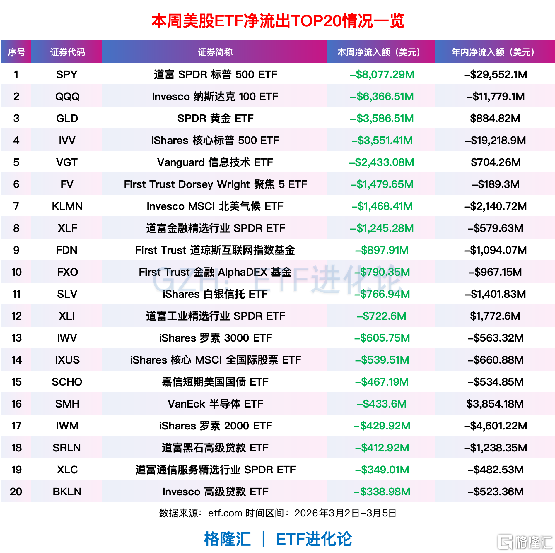 本周前四天,道富SPDR标普500ETF、Invesco纳斯达克100ETF和SPDR黄金ETF分别净流出80亿美元、63亿美元和35亿美元。
