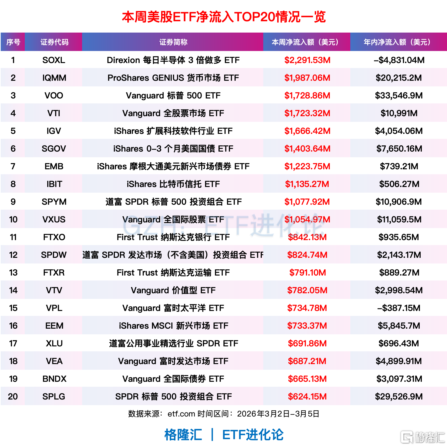 Direxion每日半导体3倍做多ETF、ProShares GENIUS货币市场ETF本周净流入超19亿美元,还有国债ETF、价值型、运输ETF和公用事业ETF也备受资金青睐。