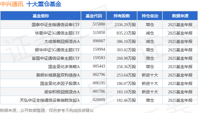 持有中兴通讯最多的基金为国泰中证全指通信设备ETF,目前规模为136.38亿元,最新净值1.0825(3月6日),较上一交易日下跌1.12%,近一年上涨137.95%。该基金现任基金经理为艾小军。