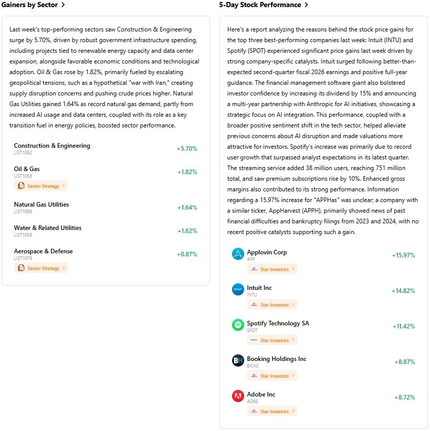 市场表现概览:美国主要股指本周经历了剧烈波动。标普500指数周一小幅上涨( 0.1%),周二下跌(-0.9%),周三反弹( 0.8%),周五收盘下跌1.33%。道琼斯工业平均指数遵循类似模式,周一下跌0.1%,周二下跌0.8%,周三攀升0.5%,周五收跌0.95%。Nasdaq综合指数周一上涨0.4%,周二下跌1%,周三反弹1.3%,周五收跌1.51%。板块表现呈现向防御性领域的轮动。受地缘政治担忧影响,能源和国防股在本周初反弹。科技和金融股在周五大幅下跌,而软件股因人工智能(AI)颠覆性风险的担忧而承压。