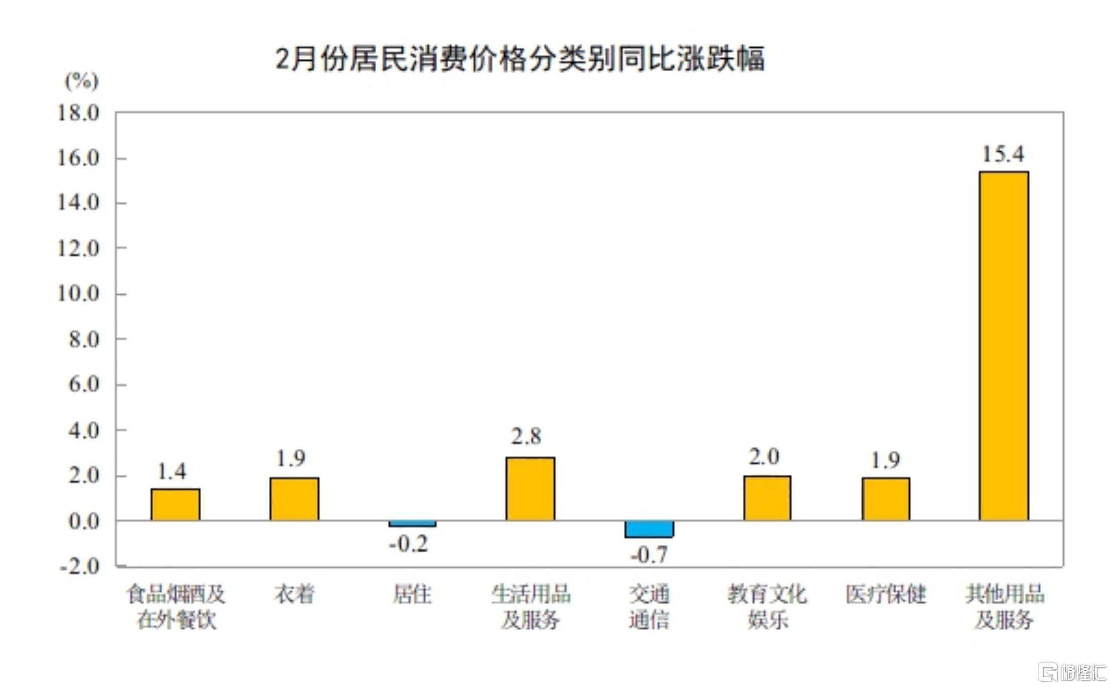 2月份,食品烟酒及在外餐饮类价格同比上涨1.4%,影响CPI(居民消费价格指数)上涨约0.41个百分点。食品中,鲜菜价格上涨10.9%,影响CPI上涨约0.19个百分点;水产品价格上涨6.1%,影响CPI上涨约0.11个百分点;鲜果价格上涨5.9%,影响CPI上涨约0.12个百分点;蛋类价格下降2.9%,影响CPI下降约0.02个百分点;畜肉类价格下降2.7%,影响CPI下降约0.11个百分点,其中猪肉价格下降8.6%,影响CPI下降约0.17个百分点。