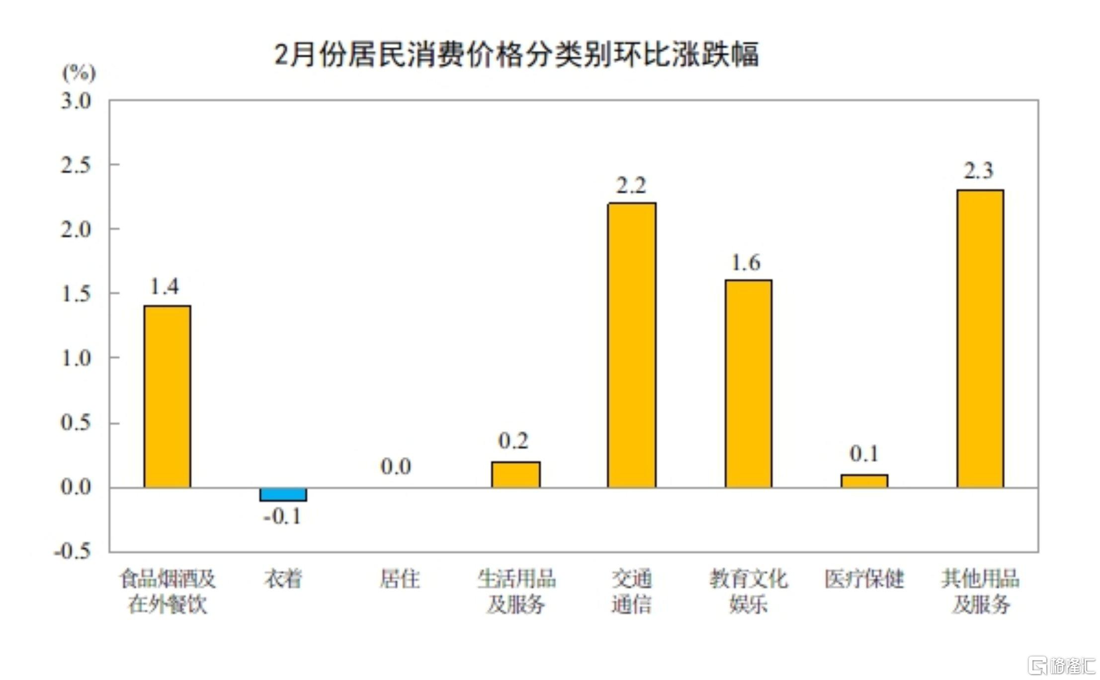 从环比看,全国CPI涨幅由上月的0.2%扩大至1.0%,为近两年来最高,主要是受春节假期较长消费需求集中释放影响,服务价格上涨较多,涨幅高于季节性水平。服务价格上涨1.1%,涨幅比上月扩大0.9个百分点,影响CPI环比上涨约0.54个百分点。服务中,飞机票、交通工具租赁、旅行社收费和宾馆住宿价格分别上涨31.1%、24.7%、15.8%和7.3%,四项合计影响CPI环比上涨约0.32个百分点,占CPI总涨幅超三成;宠物服务、车辆修理与保养、家政服务价格分别上涨12.0%、11.6%、3.1%,电影及演出票、在外餐饮价格分别上涨9.9%和1.1%,五项合计影响CPI环比上涨约0.18个百分点。工业消费品价格上涨0.4%,涨幅比上月扩大0.1个百分点。其中,受国际金价上行影响,国内黄金饰品价格上涨6.2%,国际地缘政治冲突对能源价格影响传导作用显现,国内汽油价格上涨3.1%,两项合计影响CPI环比上涨约0.12个百分点。尽管食品价格由上月持平转为上涨1.9%,但涨幅仍低于季节性水平,影响CPI环比上涨约0.33个百分点。食品中,节日期间需求增加,水产品、鲜果和猪肉价格分别上涨6.9%、4.0%和4.0%,羊肉、牛肉、鸡蛋和禽肉价格涨幅在1.6%—2.2%之间,合计影响CPI环比上涨约0.34个百分点;鲜菜市场供应充足,价格下降0.1%。