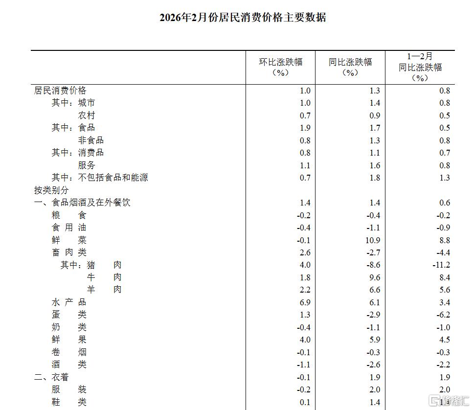 2026年2月份,全国居民消费价格同比上涨1.3%。其中,城市上涨1.4%,农村上涨0.9%;食品价格上涨1.7%,非食品价格上涨1.3%;消费品价格上涨1.1%,服务价格上涨1.6%。1—2月平均,全国居民消费价格比上年同期上涨0.8%。