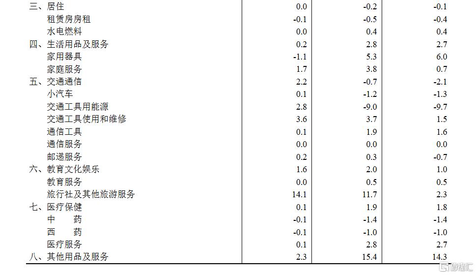 其他七大类价格同比五涨两降。其中,其他用品及服务、生活用品及服务、教育文化娱乐价格分别上涨15.4%、2.8%和2.0%,衣着、医疗保健价格均上涨1.9%;交通通信、居住价格分别下降0.7%和0.2%。