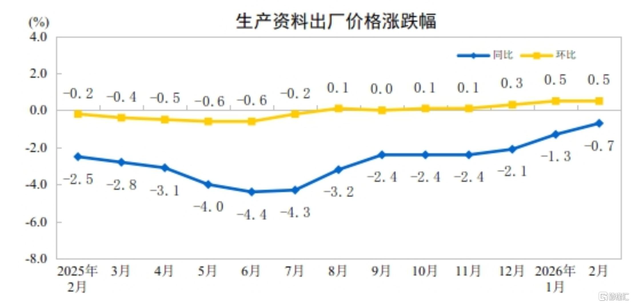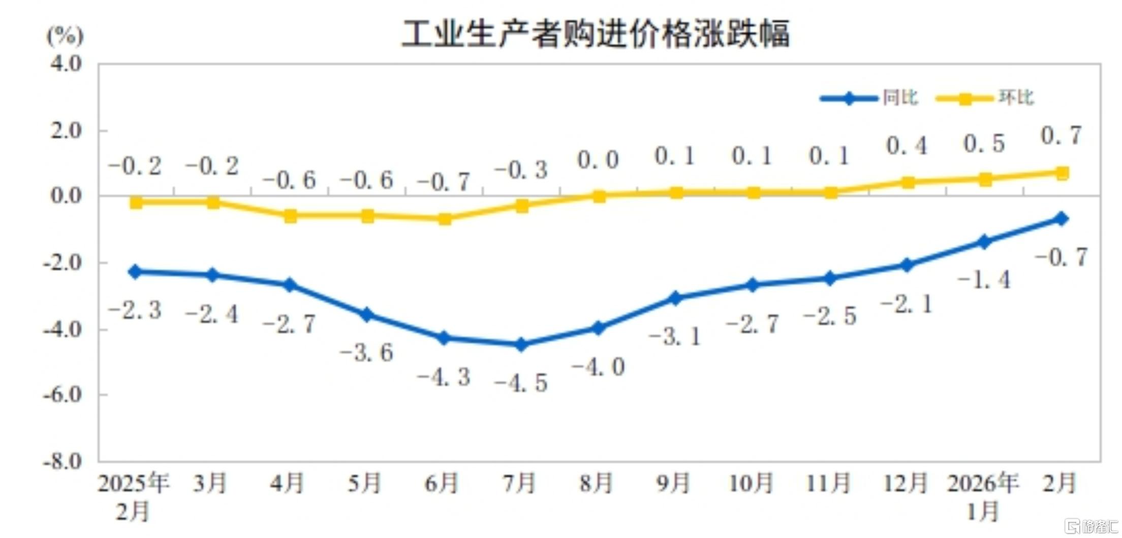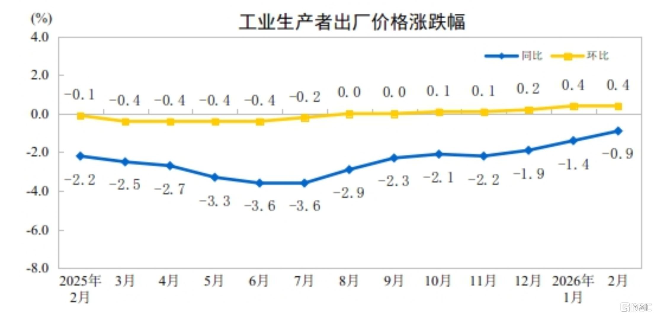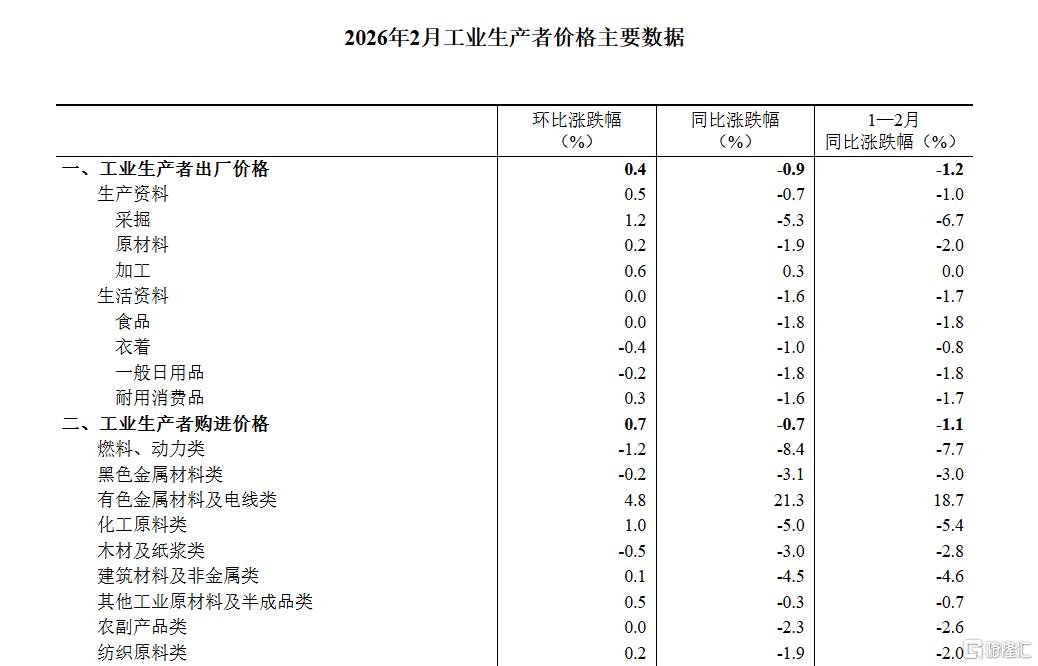 2026年2月份,全国工业生产者出厂价格同比下降0.9%,降幅比上月收窄0.5个百分点;环比上涨0.4%,涨幅与上月相同。工业生产者购进价格同比下降0.7%,降幅比上月收窄0.7个百分点;环比上涨0.7%,涨幅比上月扩大0.2个百分点。1—2月平均,工业生产者出厂价格比上年同期下降1.2%,工业生产者购进价格下降1.1%。