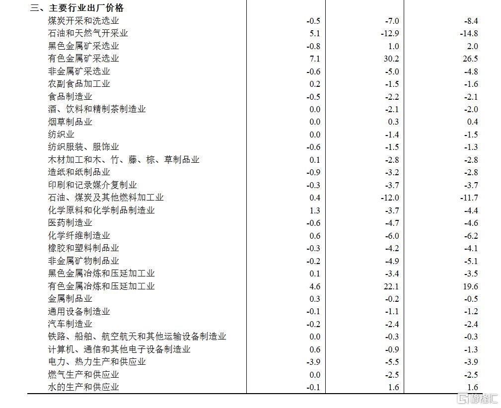 工业生产者购进价格中,燃料动力类价格下降8.4%,化工原料类价格下降5.0%,建筑材料及非金属类价格下降4.5%,黑色金属材料类价格下降3.1%,农副产品类价格下降2.3%,纺织原料类价格下降1.9%;有色金属材料及电线类价格上涨21.3%。