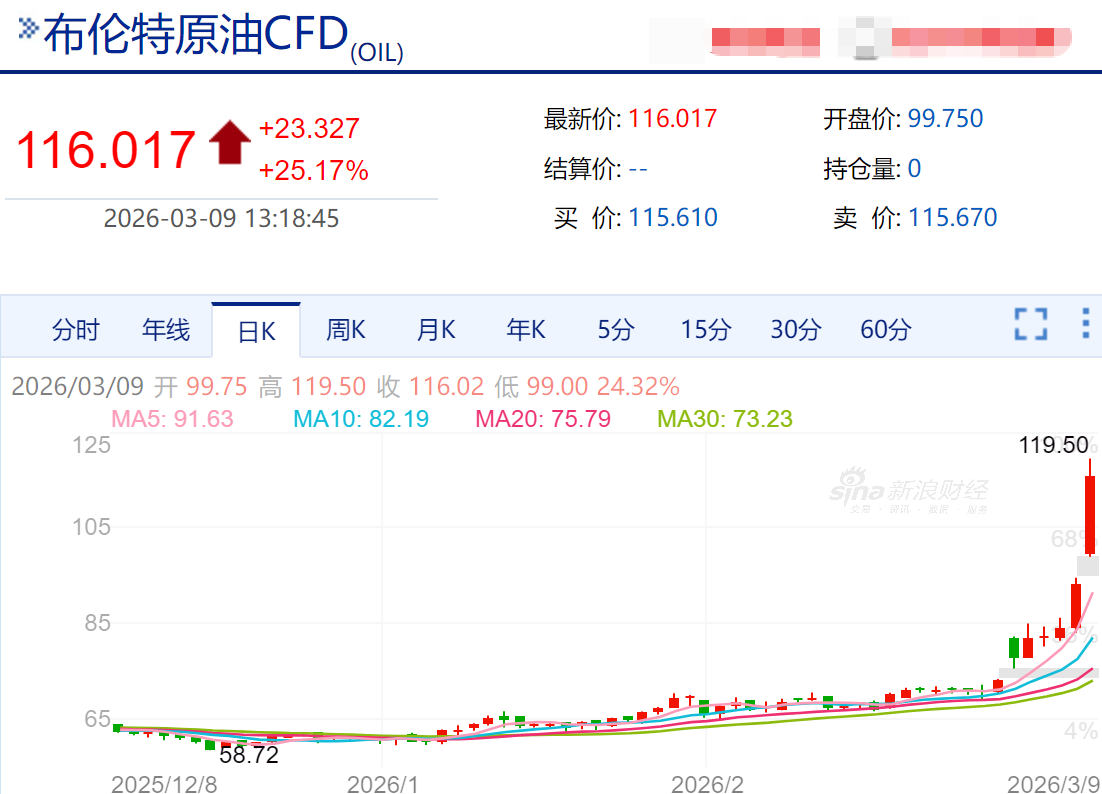 国际油价随之井喷,今日纽约原油盘中暴涨超30%,价格最高至119.48美元/桶,布伦特原油最高涨超28%,价格冲至119.50美元/桶。