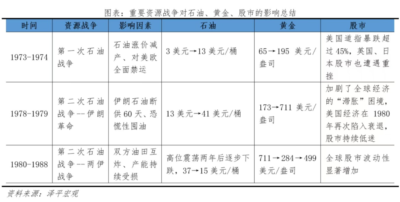 泽平宏观复盘了历史上两轮石油战争的情况,其中第一次石油战争(1973-1974)中,阿拉伯产油国为报复西方支持以色列,首次运用石油武器,实施禁运。油价3个月内从3美元暴涨至13美元,涨幅4倍。黄金开启十年牛市,美国经济陷入严重滞胀,股市一度崩盘。第二次石油战争(1978-1980)中,在1979年伊朗伊斯兰革命,第二大产油国停止出口60天,油价从13美元飙升至34美元。1980年两伊战争爆发,油价冲至41美元历史高位。