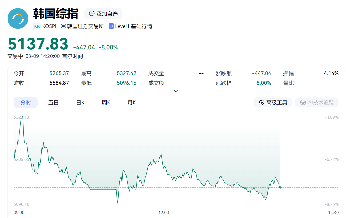 韩国和日本股市遭到重创,其中韩国综指一度连续2天暴跌7.24%和12.06%,两天市值蒸发634.1万亿韩元(约合3万亿元人民币),韩国政府紧急抛出高达100万亿韩元的市场稳定计划,今日韩国综指暴跌超8%触发熔断。