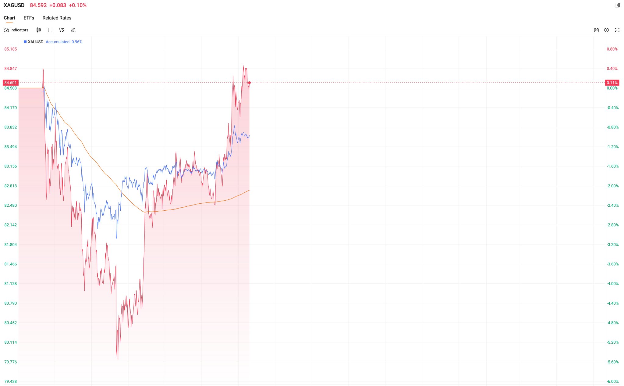 TradingKey - 亚洲交易时段,白银受美元走强以及市场风险偏好影响,一度遭到市场抛售,开盘后一路下杀至大跌5.6%,后强势反弹至涨超0.4%,日内振幅超6%。同属贵金属的黄金,开盘也遭到市场抛售一度跌近3%。