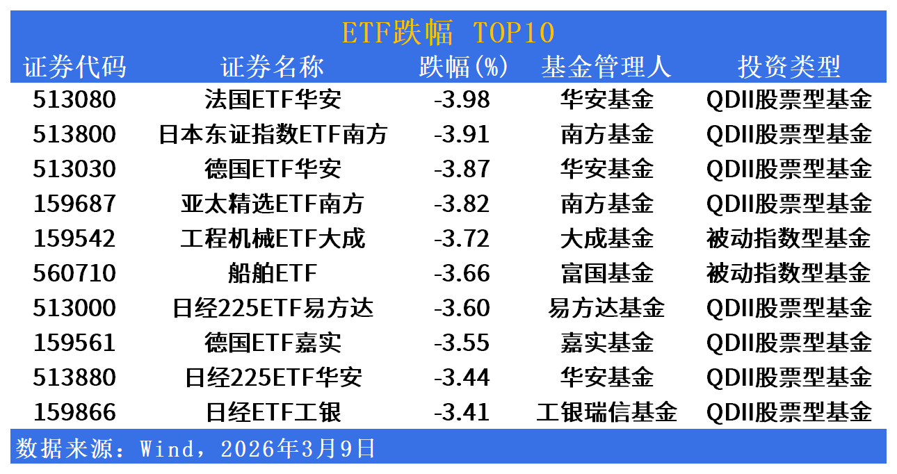法国、德国及日本市场相关QDII产品今日跌幅居前,亚太精选ETF及工程机械、船舶等周期类ETF同步回落,海外市场波动风险显著传导至境内ETF市场。