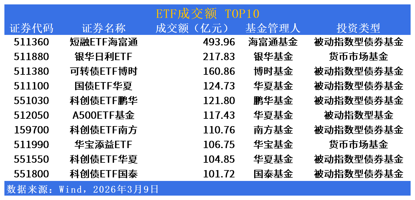海富通短融ETF(511360)单日成交493.96亿元稳居第一,银华日利ETF(511880)成交217.83亿元。债券ETF集群表现活跃,博时可转债ETF(511380)成交160.86亿元,华夏国债ETF(511100)成交124.73亿元,鹏华科创债ETF(551030)成交121.80亿元,南方科创债ETF(159700)成交110.76亿元,华夏科创债ETF(551550)成交104.85亿元,国泰科创债ETF(551800)成交101.72亿元。