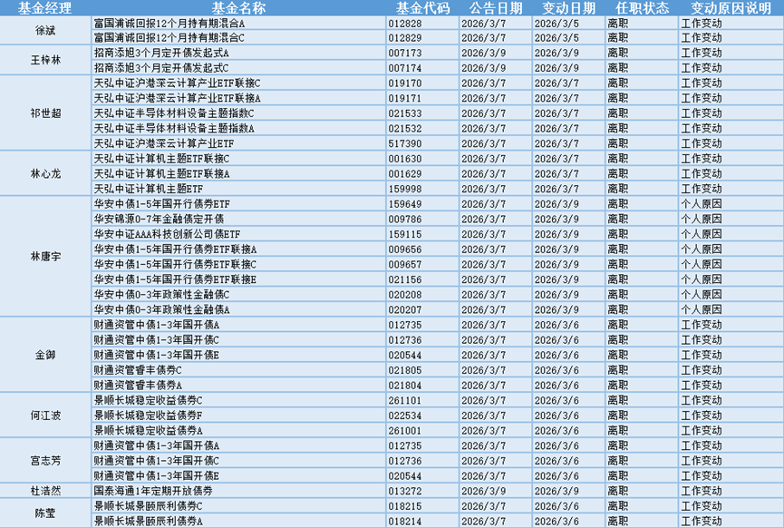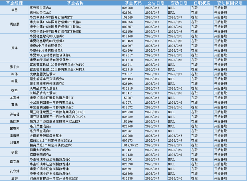 基金经理是一只基金产品最核心的成员,能决定一只基金的投资方向、投资策略以及投资风格,基金经理出色的择时选股能力和调研预测能力是基金业绩的有力保证,所以基金经理是投资者在选择基金产品时的重要依据。基金经理的变动很大程度上会影响到基金产品未来的表现,是一个需要特别关注的信息。3月7日~3月9日共有32位基金经理发生任职变动。