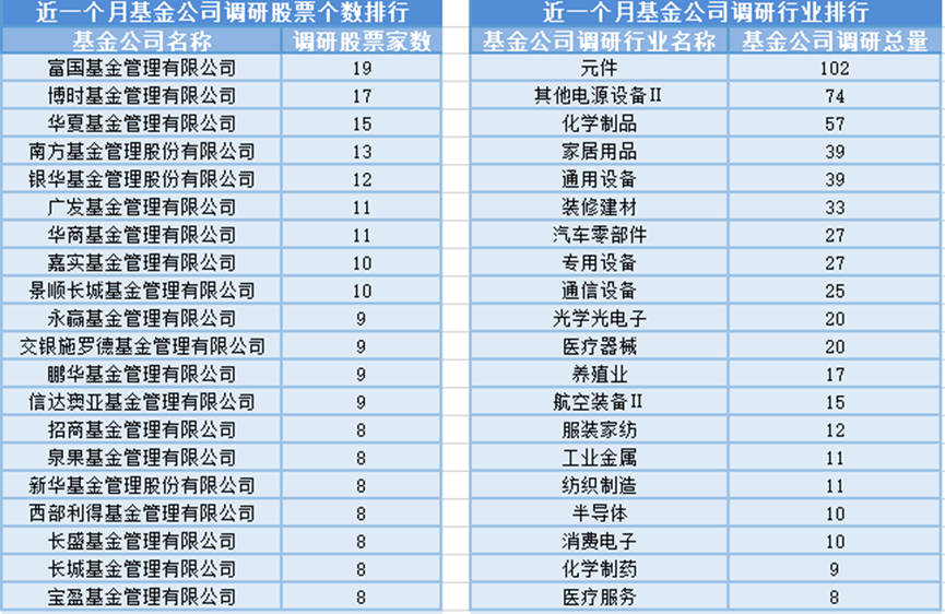近一个月(2月7日-3月9日),富国基金参与公司调研的数量最多,共调研19家上市公司,此外调研较为活跃的还有博时基金、华夏基金和南方基金,分别调研17家、15家、13家上市公司;从调研行业上来看,基金公司对元件行业的上市公司调研次数最多,共有102次,其次是其他电源设备Ⅱ行业,基金公司调研了74次。